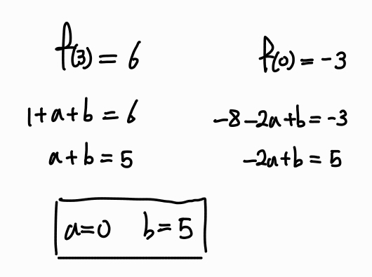 이후에 f(0) = -3, f(3) = 6 을 이용해 a, b의 값을 구하면 된다