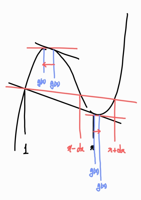 여기서 접하는 x에서 앞뒤로 dx만큼 움직일 때를 보면