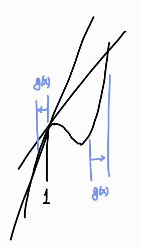 극대부분에서는 접할 때 g(x)가 극대값을 가지고 x가 증가할수록 다시 줄어드는 모습이 보이고